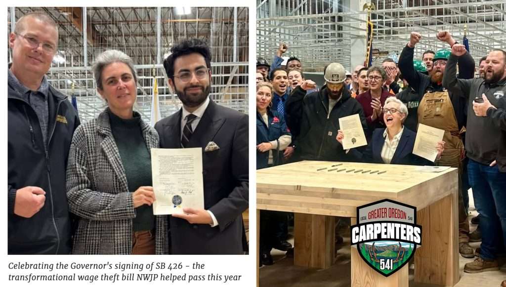 This year, NWJP partnered with the Western States Carpenters Union to pass Senate Bill 426. It was an uphill fight, but the Carpenters Union led an incredible legislative campaign, focused on workers’ experiences. The new law requires general contractors and large property owners to take responsibility for wage theft that happens on their projects.